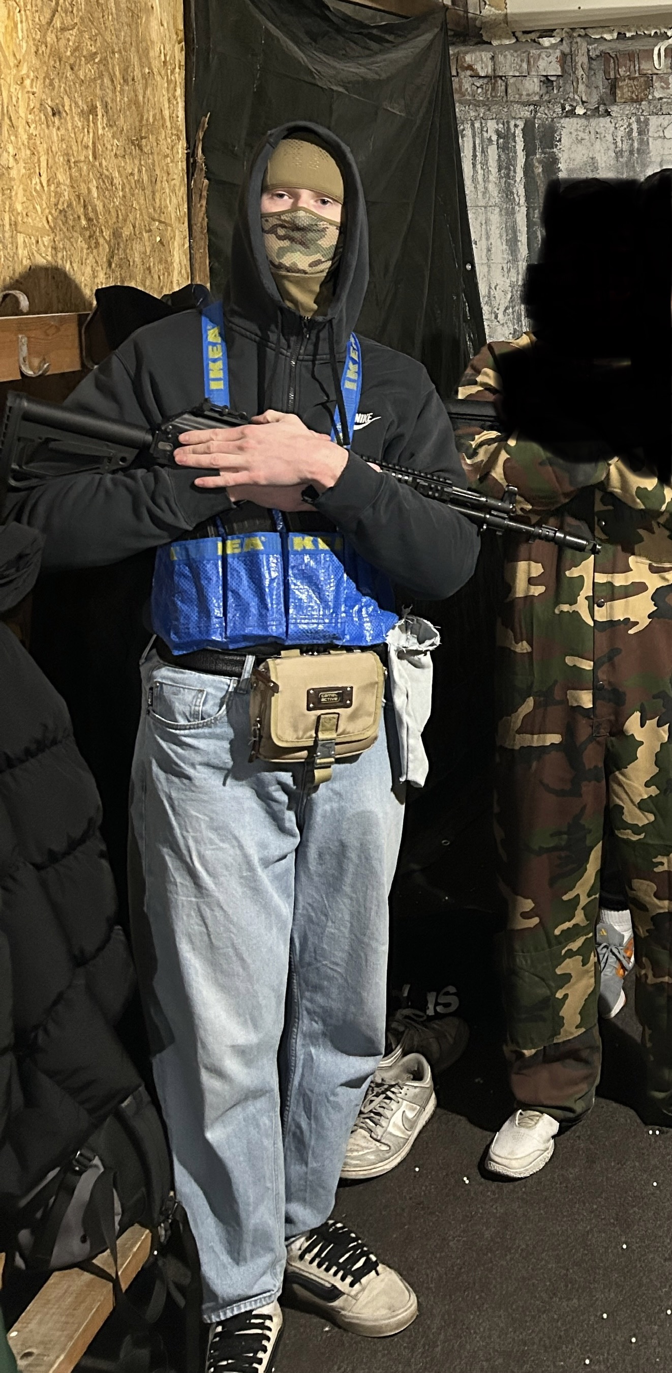 Nike hoodie, Ikea chestrig, Armani belt, Сбросник из джинс, Camel bag, Джинсы, Vans white old skool, Nb tactical mask